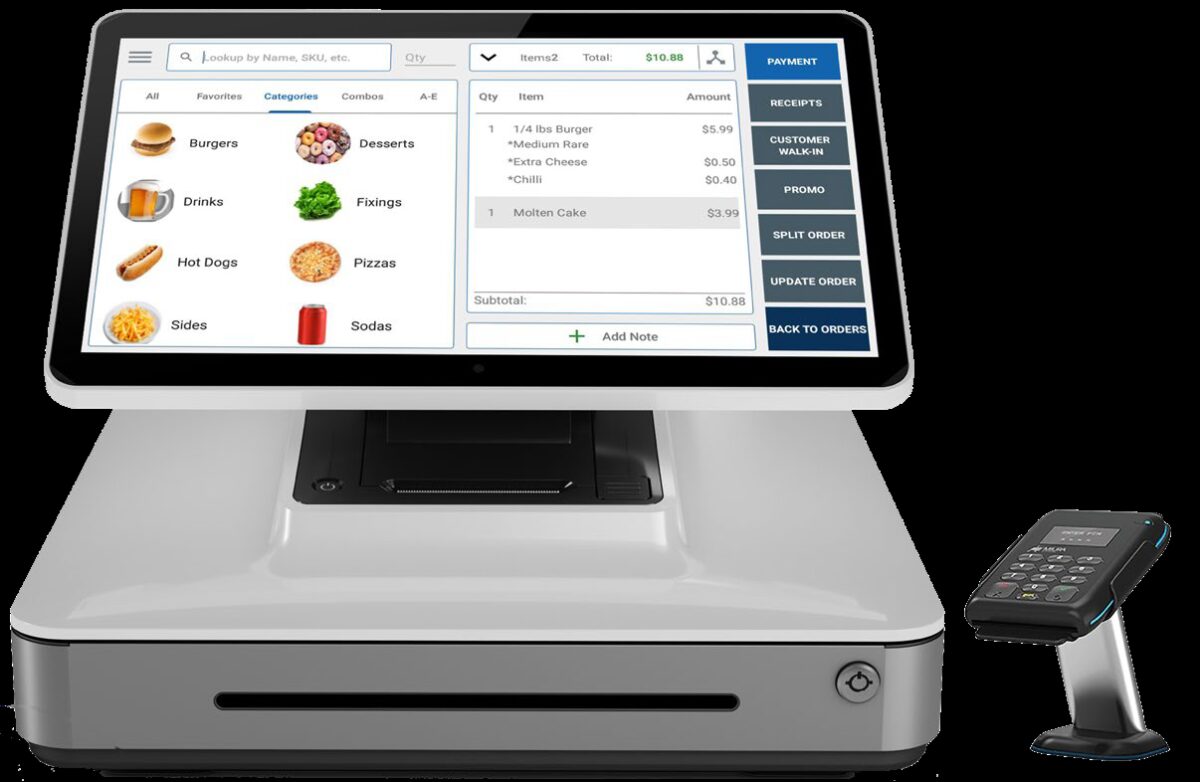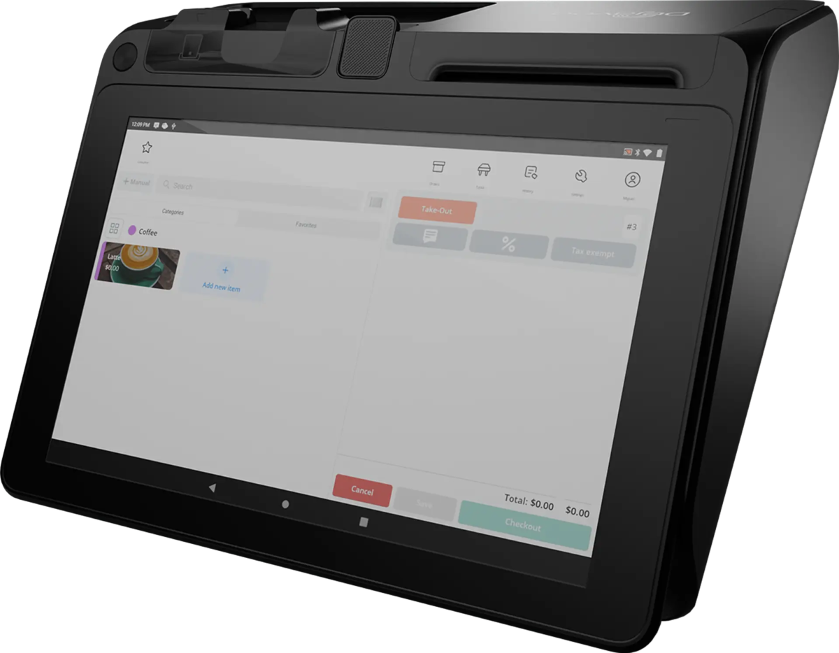 Intelligent, compact and portable Android Cash Register with 11.6” Screen, 3” Receipt Printer, QR Code Scanner, Camera, Customer Display and a Bluetooth EMV/MSR reader with PIN Pad and NFC for contactless/tap payments.
